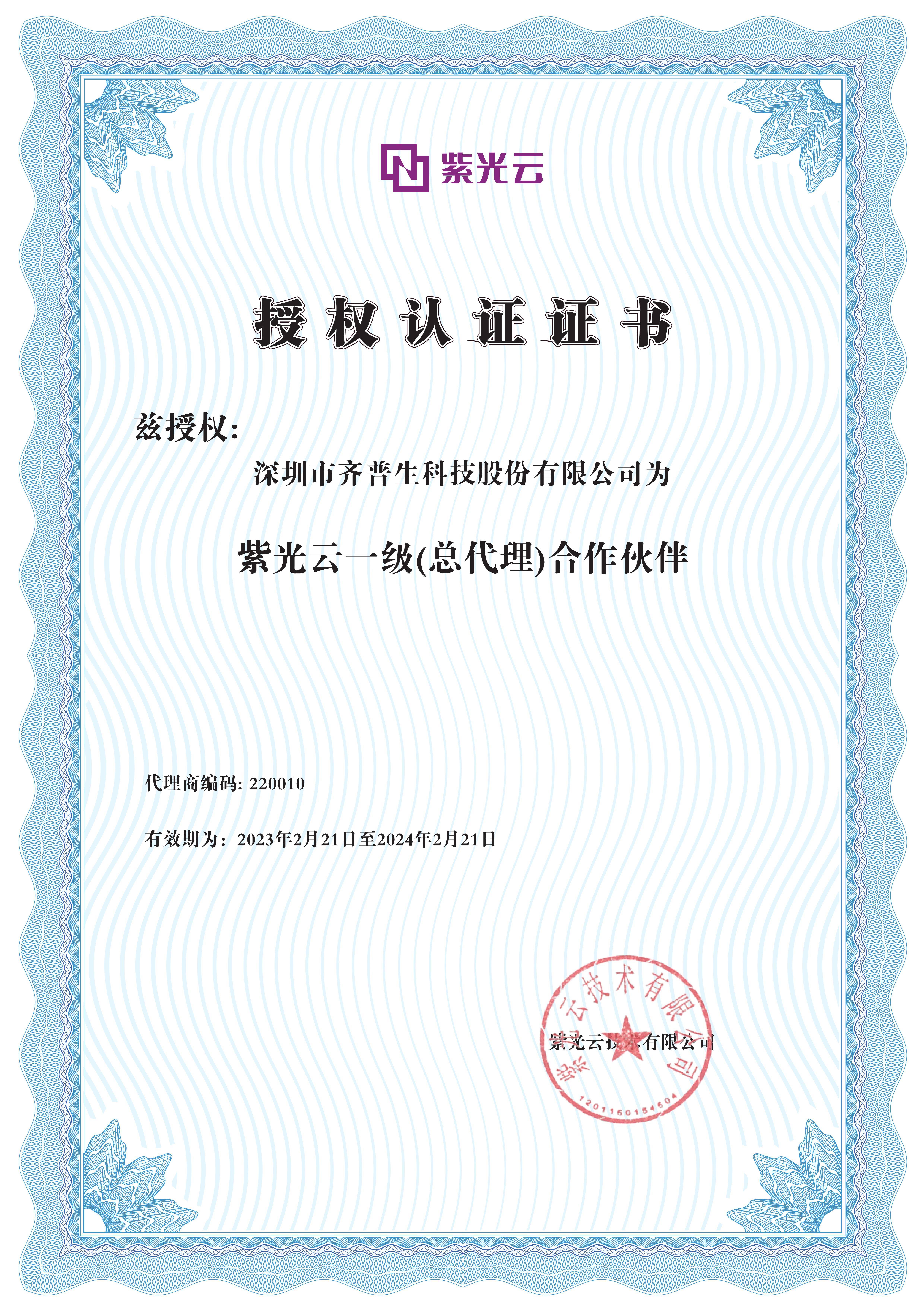 • 紫光云總代理證書
